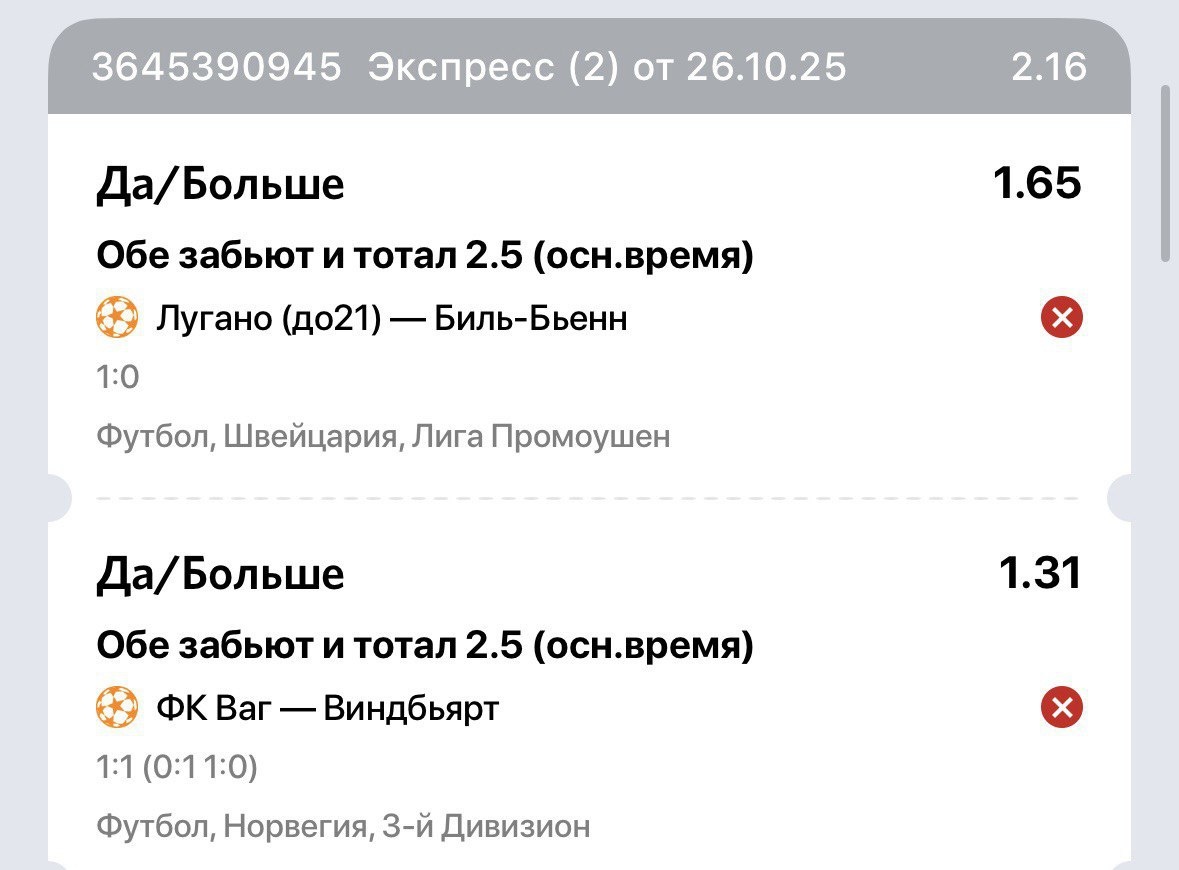 В ответ на пост Смотрите, какая красота была в теории ☕️ ✅ Лугано - Биль: У обеих команд последние 8-9 матчей - обе забьют и ТБ 2.5. Сплошные голы и взаимная вежливость! ✅ Ваг - Виндбьярт: 10 матчей подряд ТБ 2.5, обе команды забивают в хвост и в гриву. Итог? Лугано 1:0 Биль / Ваг 1:1 Виндбьярт 😄 Футбол играется в настоящем, статистика - это прошлое, не гарантия, но вероятность.