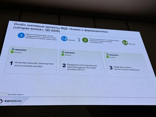 Грантовое финансирование от фонда "Сколково" в размере 589,6 млн руб. обеспечит три особо значимых проекта компаний ИЦК "Химия и фармацевтика". Все три гранта получило АО "Апатит" (группа "ФосАгро"). Проекты стали победителями во второй волне отбора, а их совокупный бюджет превышает 1,8 млрд руб. Алексей Миколенко © ComNews 27.10.2025 24 октября на площадке АО "Щелково Агрохим" якорные заказчики, получившие гранты на разработку особо значимых проектов (ОЗП), представили результаты работы вместе с разработчиками. Секретарь индустриального центра компетенций (ИЦК) "Химия и фармацевтика" Кирилл Киреев напомнил, что отбор первой волны особо значимых проектов состоялся в конце 2022 г.: "В нашем ИЦК мы утвердили девять инициатив. На данный момент пять проектов завершены, еще четыре активно реализуются. Оставшиеся проекты разработчики вместе с заказчиками завершат в этом или следующем году, так как это масштабные и длительные инициативы. Некоторые