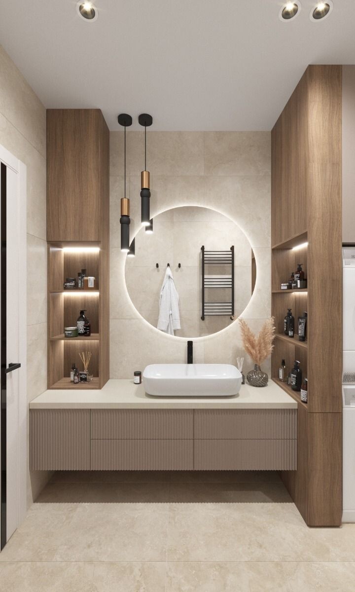 Главное, чтобы все поверхности выглядели цельно и не спорили друг с другом. Чистые линии и отсутствие видимых труб сразу повышают визуальный уровень интерьера.