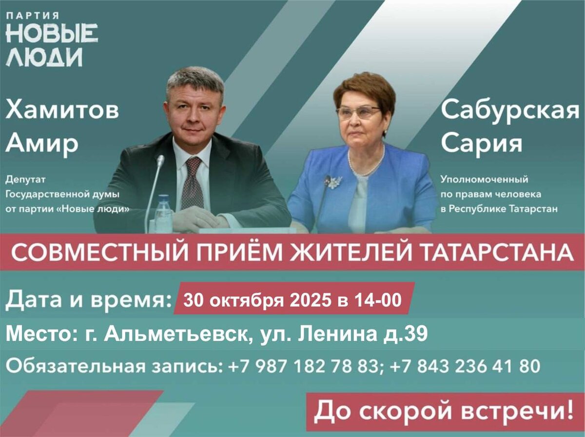 30 октября в 14:00 я совместно с Уполномоченным по правам человека в Республике Татарстан Сарией Сабурской проведу прием граждан в г. Альметьевск. На встрече мы ответим на ваши вопросы, окажем содействие в решении проблем региона, примем ваши обращения и обеспечим личный контроль за разрешением проблемных ситуаций в Республике Татарстан. Обязательная регистрация по телефонам: +7 843 236 41 80; +7 987 182 78 83.