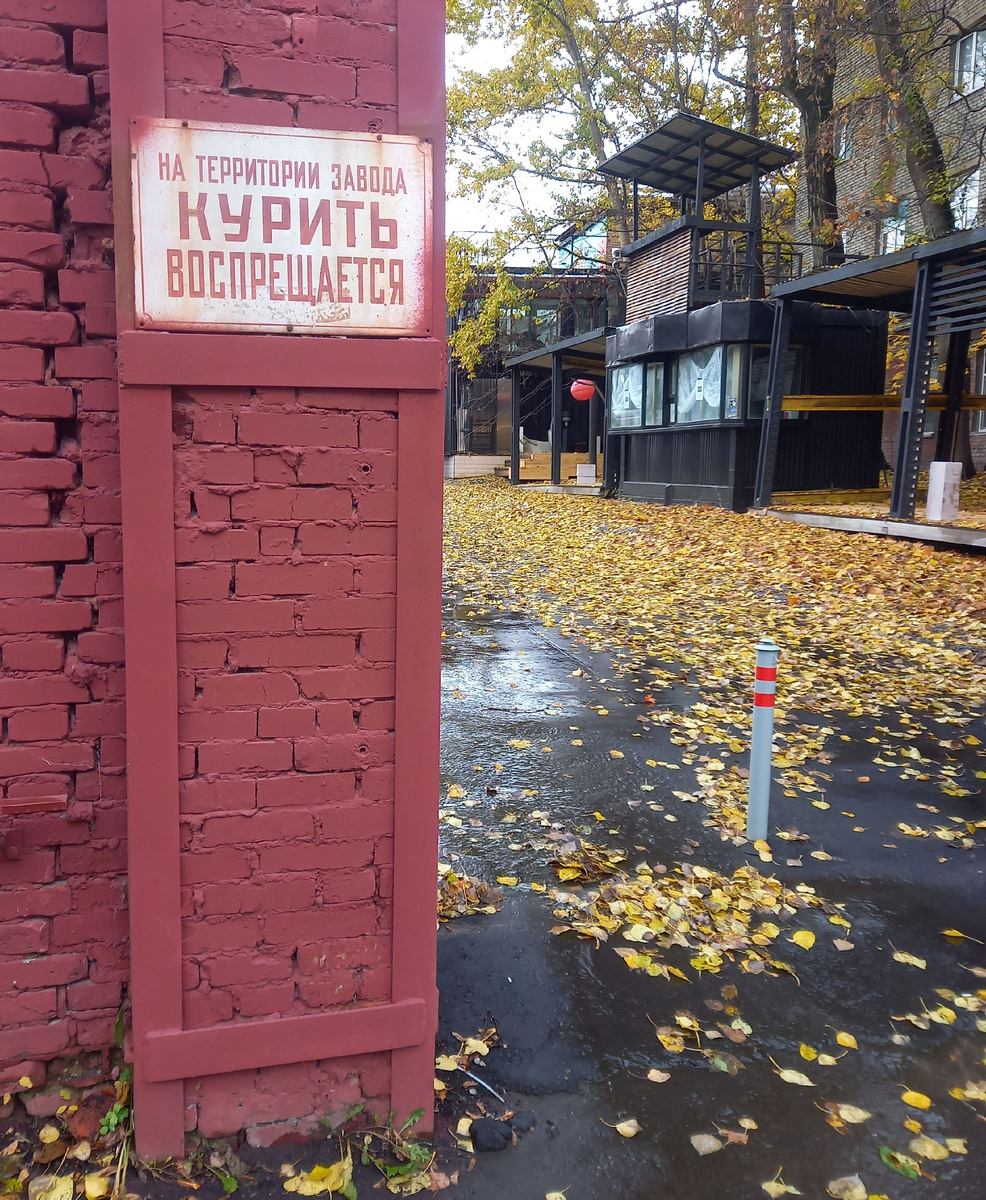 И найти его можно на территории бывшего Московского ликеро-водочного завода «Кристалл» на Самокатной улице, ныне превращенного в новомодное «мультиформатное» пространство с офисами, кафе, магазинами, мастерскими и выставочными центрами. Ларек типовой формы, очевидно некогда красовавшийся на одной из улиц Москвы, ныне нашел свое пристанище при входе на территорию «Кристалла» со стороны Золоторожской набережной, неподалеку от Сыромятнического гидроузла. Стоит лишь шагнуть за гостеприимно открытые ворота бывшего завода, и вот он перед нами, красавец родом из «Лихих 90-х», времени свободной торговли и почти что вседозволенности.