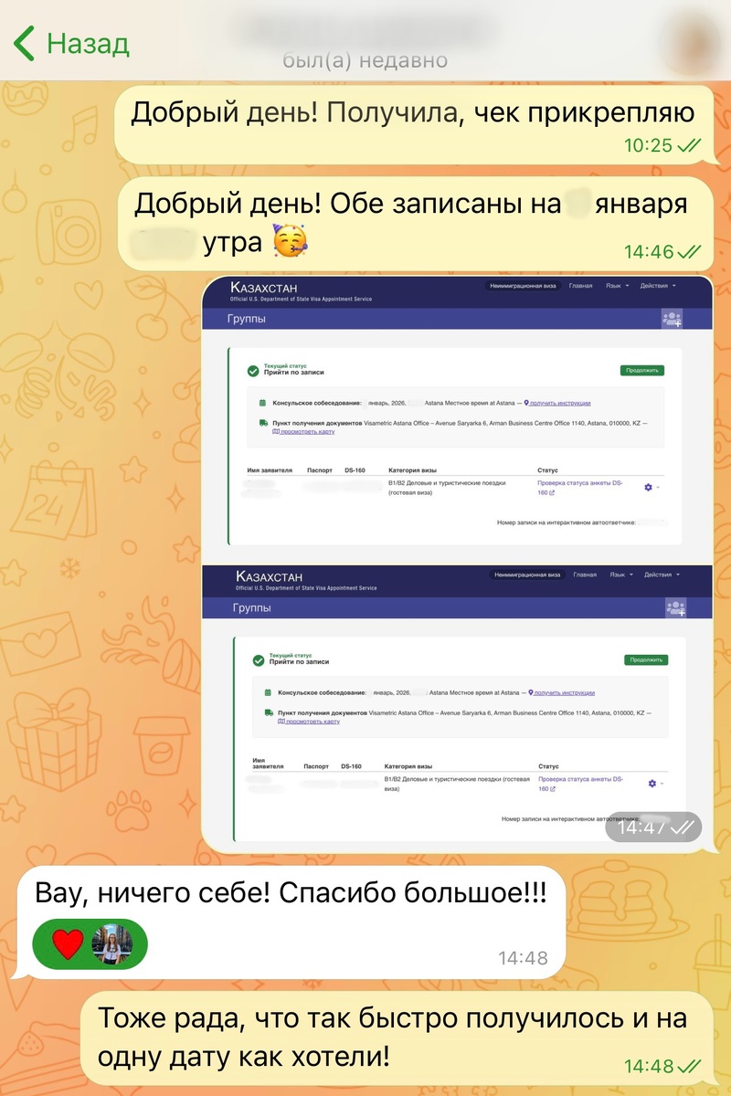 У нас была задача: записать 2 людей в Астану на собеседование по туристической визе США B1/B2. С момента оплаты услуги до момента записи прошло менее 1 дня! И особо приятно, что клиент обращается за записью для своих родственников уже второй раз: 3 года назад мы тоже помогали им с записью. Спасибо, что остаетесь с нами! Мини-отзыв: Обращайтесь! Наш телеграм-канал GOOD VISA USA: https://t.me/goodvisaus Какие услуги еще имеются: - полное сопровождение - консультация / подготовка к интервью - заполнение анкеты #туристическаявизасша #визасша2025 #визасшаб1б2 #гостеваявизасша #визавамерику #подачанавизусша #деловаяивзасша #визадлясша #визысша #собеседованиесша #визасшасамостоятельно #американскаявизасша #собеседованиевпосольствесша #американскаявиза #какполучитьвизусша #туризмвсша #визасшаастана #помощьповизесша #визасшаавтоматическаязапись #какувеличитьшансынаодобрениевизысша #визасшаказахстан #визасшаинтервью #визасшакакпройтисобеседование #визасша2026 #визасшародителям #визасшавгости #ви