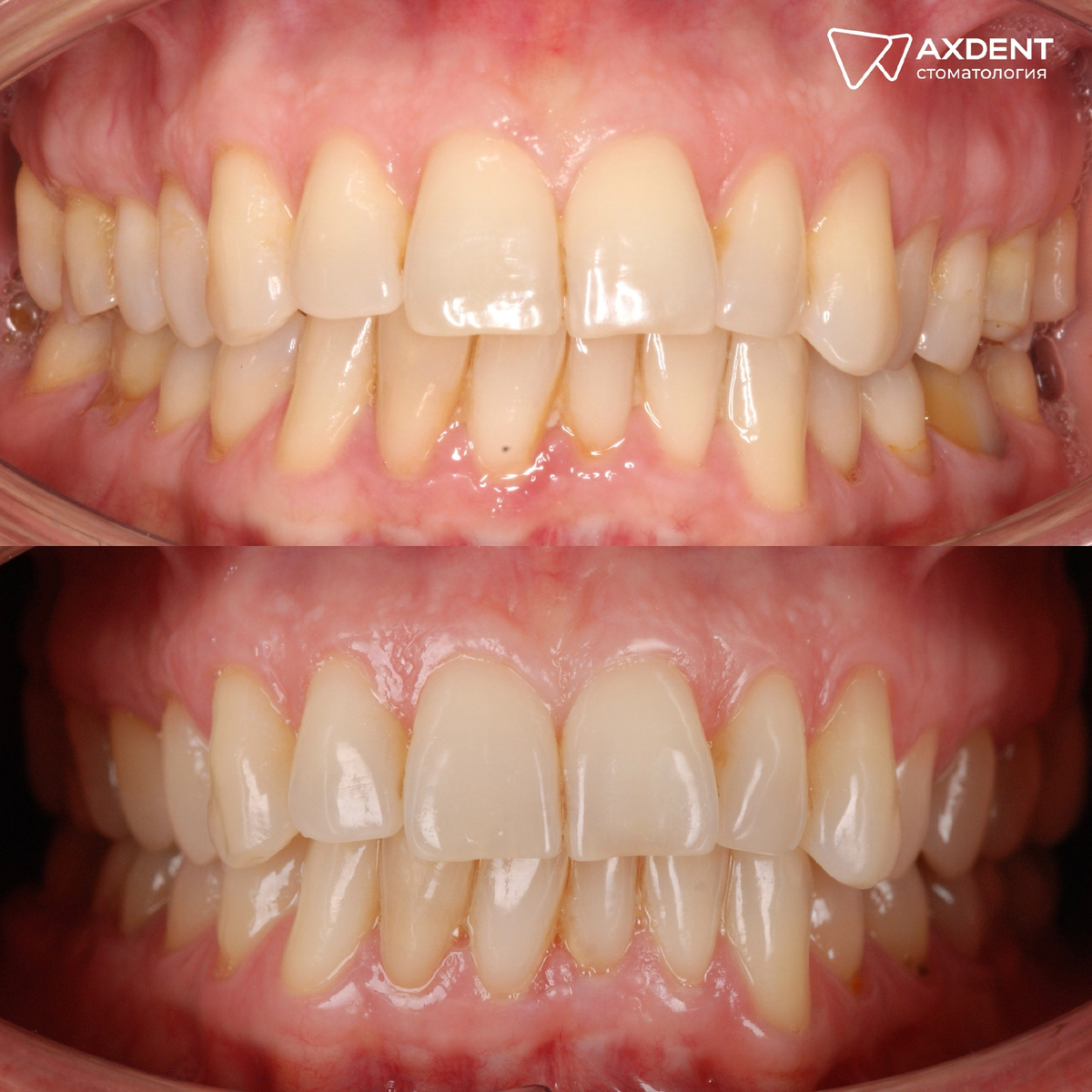 Знаете, как иногда жизнь подбрасывает удивительные встречи? Эта пациентка появилась у нас сначала как сопровождающая — приходила на приёмы со своим близким человеком, композитором из туманного Альбиона. Мы обсуждали музыку, природу, виски... Но о её зубах речь не заходила. Никогда. Но дама о виски-то говорила, а сама наблюдала, как мы приводили в порядок улыбку её спутника. Видела все этапы — от первых сомнений до финального результата. И в какой-то момент произошло то, что я называю "эффектом наглядного примера". Когда лечение её друга было завершено, она взяла нас в оборот: "А что с моими зубами?". Так начался наш путь. Первое, с чем мы столкнулись — настоящий "археологический слой" проблем. Но — никакой драмы. Просто пошаговое решение: Сначала перелечили все проблемные каналы. Затем, чтобы защитить ослабленные зубы от дальнейшего разрушения, установили керамические реставрации на жевательные зубы верхней челюсти — с пятого по седьмой. То же самое сделали и на нижней челюсти. Один