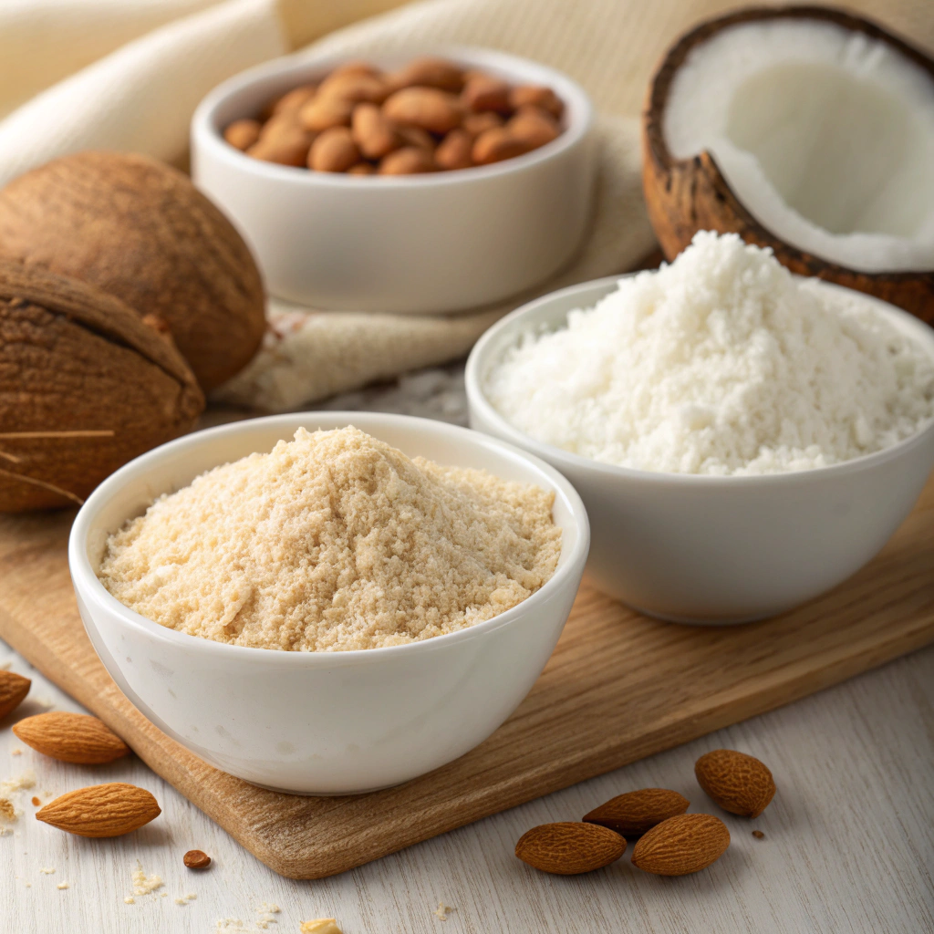 Кокосовая мука — совершенно другой продукт с уникальными свойствами. Она производится из высушенной и обезжиренной мякоти кокоса, после отжима кокосового масла. Это очень сухая и абсорбирующая мука, способная впитывать огромное количество жидкости — до 4-5 раз больше своего веса. В рецептах с кокосовой мукой обычно требуется значительно больше яиц и жидкости. Ее преимущество — минимальное содержание углеводов (около 18 граммов на 100 граммов, из которых 16 граммов — клетчатка) и нежный кокосовый аромат. Идеально подходит для воздушных бисквитов и кексов.