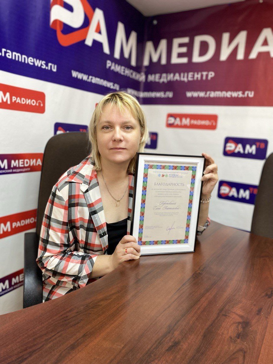 Председатель Раменского отделения Союза журналистов Подмосковья, сотрудник Раменского медиацентра Елена Перетокина удостоена благодарности Общероссийской общественно-государственной организации "Ассамблея народов России"