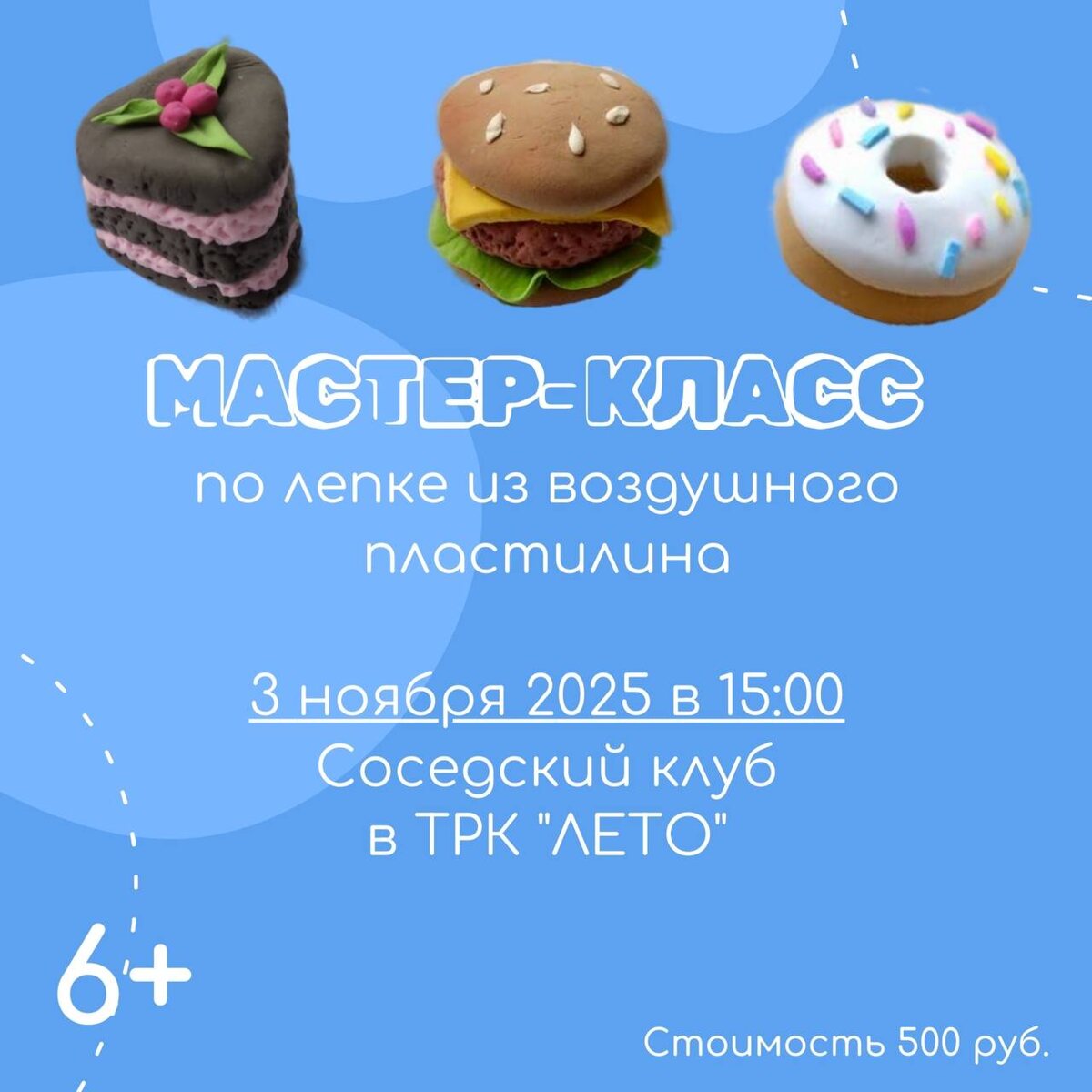 Уважаемые родители !!! Приглашаю Ваших детей в увлекательное путешествие в мир лепки! Это отличный способ познакомиться с миром творчества, развить мелкую моторику и фантазию. Тема: «кафе - еда из воздушного пластилина " Материал: воздушный пластилин Продолжительность: 1-1.5 часа. Приходим на занятие в хорошем настроении и сытыми. Сами понимаете тема занятия очень вкусная 😁 Для детей в возрасте от 6 до 12 лет. Количество мест до 6 человек! Ждем вас 3 ноября в 15:00 Стоимость 500 руб. Соседский клуб, вход через кинотеатр Люксор, 2-й этаж. До встречи!