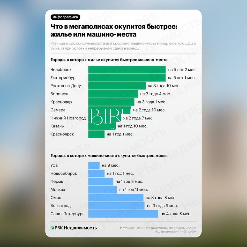 Квартира VS парковка — что приносит больше денег? Вы удивитесь, но в некоторых городах машино-место может обойти квартиру по доходности. Где? → Вот где выгоднее парковка: • Санкт-Петербург: парковка — 13 лет и 2 месяца, квартира — 17 лет и 10 месяцев. • Москва: парковка — 15 лет и 2 месяца, квартира — 17 лет и 1 месяц. • Волгоград и Омск: парковка окупается быстрее примерно на 3,5 года. → А где квартиры окупаются быстрее? По данным РБК Недвижимость: В среднем по российским миллионникам квартира окупается примерно за 14,5 лет, а парковка — за 16 лет и 1 месяц. Разница — около полутора лет в пользу квартир. • Челябинск: квартира — 13 лет, парковка — 18 лет и 2 месяца. • Екатеринбург: квартира — 13 лет и 4 месяца, парковка — 18 лет и 5 месяцев. Разница — более 5 лет. _______ 🔥 Напишите в WhatsApp для консультации