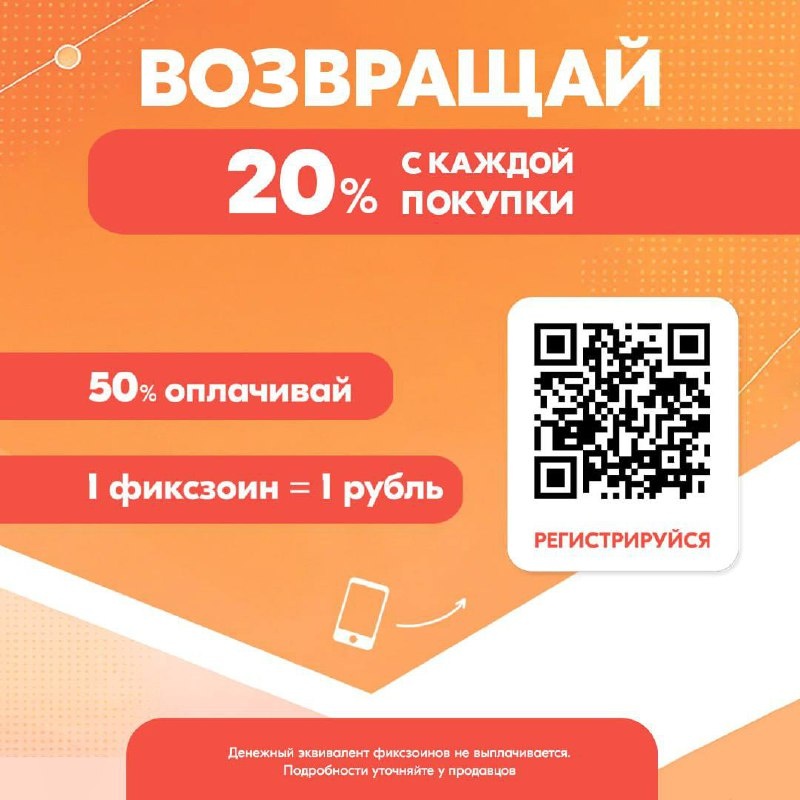 ⚡️Мы обновили программу лояльности, сделав её еще более выгодной! Теперь после каждой покупки вам на карту лояльности возвращается ЦЕЛЫХ 20% от суммы покупки! Чтобы получать баллы обратно и оплачивать до 50% от всей суммы покупками фиксзоинами: 1. Зарегистрируйтесь в нашем боте: https://t.me/FixzoneBonus_bot 2. Получите свой персональный QR-код. 3. Показывайте QR-код на кассе продавцу-кассиру. 🪙1 фиксзоин = 1 рубль! Не упускайте выгоду! Экономьте вместе с FixZone! P.S. Новым клиентам начисляем 100 бонусов:)