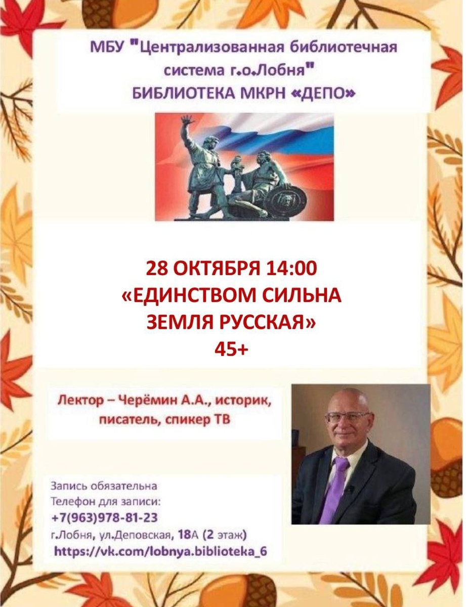 БИБЛИОТЕКА МКРН "ДЕПО" (г.о.Лобня, ул.Деповская, 18А, читальный зал) ПРИГЛАШАЕТ!!! Ко Дню народного единства 28 октября в 14:00 Исторический экскурс "ЕДИНСТВОМ СИЛЬНА ЗЕМЛЯ РУССКАЯ" Лектор: Черёмин Александр Александрович-историк, писатель, спикер ТВ