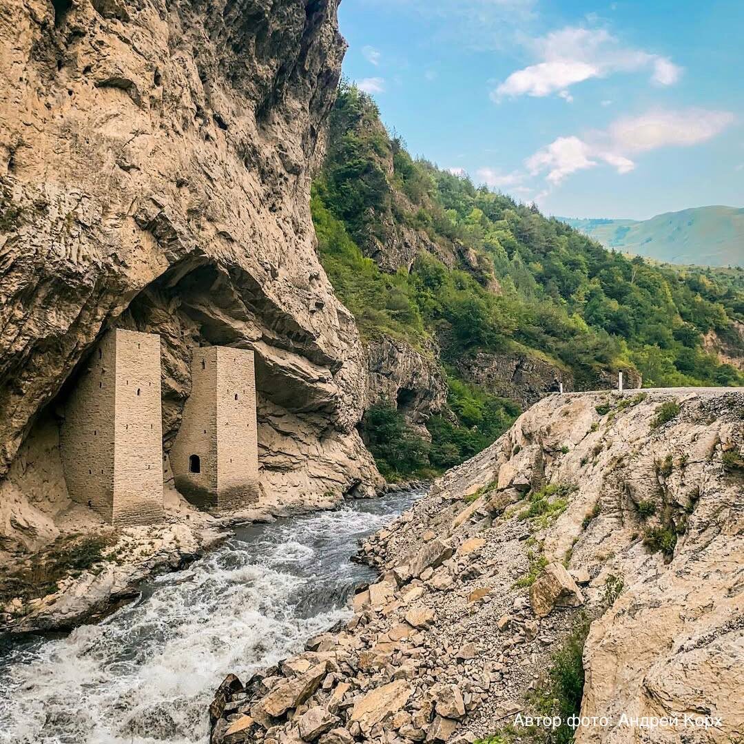 Ушкалойские башни Ушкалойские башни расположены в Итум-Калинском районе Чеченской Республики, недалеко от населенного пункта Ушкалой. Башни-близнецы, спрятавшиеся под скалой на берегу реки Чанты-Аргун, называют визитной карточкой Чечни. Эти древние сторожевые башни датируются XI–XII веками и до сих пор поражают своей прочностью и конструктивной особенностью. По одной из версий башни служили пограничными постами, стоя на границе территорий различных этнических групп, а внутри располагался таможенный пункт для взимания пошлин с проходящих людей. Другая версия главит, что башни выполняли функцию защиты, охраняя важную дорогу, которая проходила прямо под их мощными стенами, а также близлежащий мост. Башни имеют высоту около 12 метров и состоят из четырёх этажей. Интересной особенностью этих строений является то, что у каждой башни только три стены, сложенные из местного песчаника, а четвёртая стена представляет собой скалу, которая служит природной основой здания. В качестве крыши также