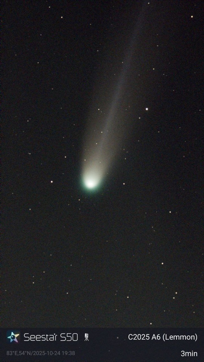 Поймал хвостатую гостью: астроном-любитель из Искитима сделал фото кометы C/2025 A6 Lemmon Владислав Жидков сделал фотографии кометы с разницей в пару дней на свой смарт-телескоп Seestar S50 и прислал их в редакцию ТВК. «Это не просто обычная неясная точка в окуляре. Когда осознаешь, что перед тобой ледяной шар, прибывший из удаленных уголков Солнечной системы, это действительно захватывает дух», - говорит сам Владислав. В Обсерватории НГУ специалисты подтвердили нам существование кометы. Что же это за комета? · Открытие: Ее обнаружили совсем недавно, 15 января 2025 года, в рамках обзора Mount Lemmon Survey (отсюда и ее «фамилия»). · Путешественница: C/2025 A6 — долгопериодическая комета. Это значит, что ее путь вокруг Солнца занимает тысячи, а то и миллионы лет. Сейчас она как раз приближается к нам, и мы имеем уникальный шанс ее увидеть! Почему это так круто? Осознание того, что ты видишь объект, который, возможно, в последний раз пролетал мимо Земли, когда по планете ходили ма