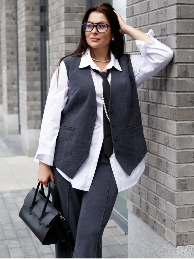 Этот жилет напоминает мне классические английские костюмы, но в современном прочтении. Вельветовая ткань добавляет образу уюта и тепла, а приталенный крой создает изящный силуэт. Удлиненный фасон хорошо сочетается с разными вещами — от рубашек до платьев.