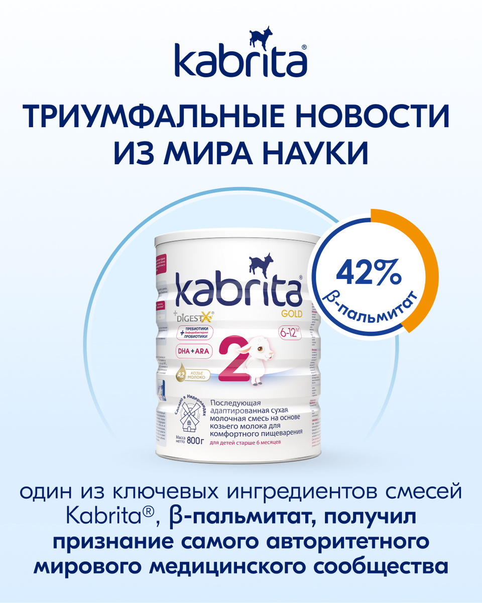 Дорогие Kabrita-мамы, с гордостью сообщаем вам, что один из ключевых ингредиентов смесей Kabrita® получил признание самого авторитетного мирового медицинского сообщества. По результатам анализа более 572 научных публикаций и клинических исследований Комитет по питанию Европейского общества детских гастроэнтерологов, гепатологов и нутрициологов (ESPGHAN) пришел к окончательному согласию, что при запорах у младенцев свою эффективность показали смеси, обогащенные высоким содержанием β-пальмитата и магния¹. Такой состав способствует размягчению стула и нормализует дефекацию. Влияние на стул смесей обогащенных пребиотиками и пробиотиками не нашло убедительных клинических подтверждений влияния на запоры, что, конечно, не обесценивает пользу таких смесей для пищеварения и поддержания иммунитета. Смеси Кабрита обогащены высоким (42%) содержанием бета-пальмитата, который способствует нормализации стула, усвоению кальция, поддержанию баланса микробиоты и повышению энергообмена². Всем здоровья и