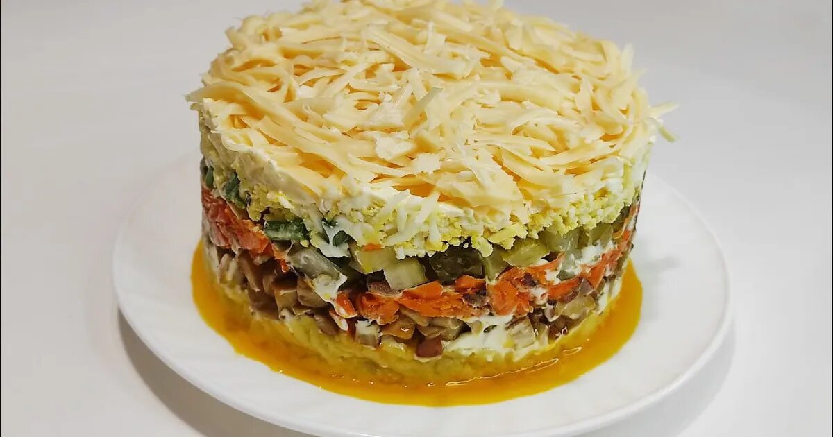 Ингредиенты: 🔹Отварной картофель - 4 шт 🔹Лук обжаренный - 3 шт 🔹Отварное мясо (на выбор: куриное, говяжье или свинина) - 300 гр 🔹Маринованный огурец - 3 шт 🔹Отварная морковь - 1 шт 🔹Вареное яйцо - 4 шт 🔹Майонез Слоями, как указано в описании, каждый слой майонезом.