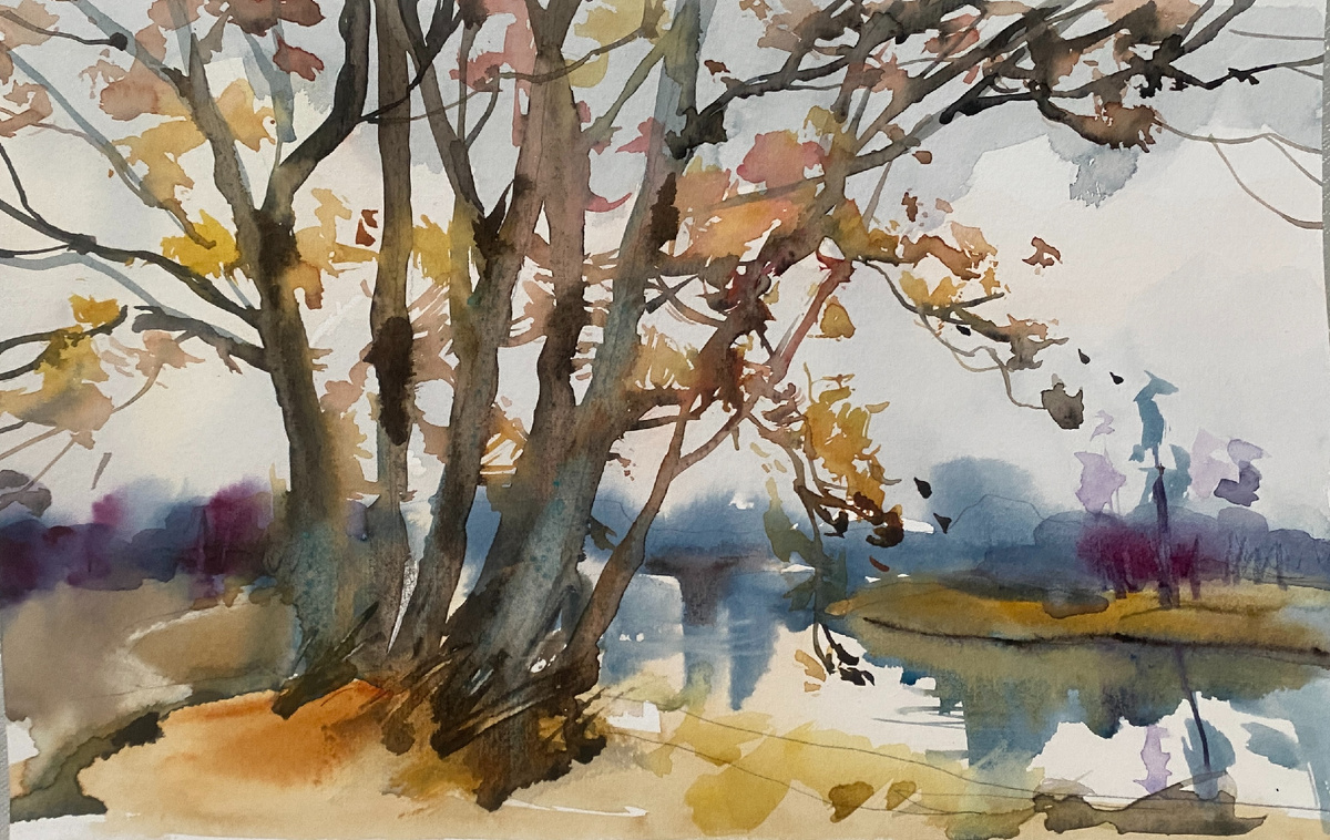 Вы думаете это белопенный май? Или может быть сочный август? А я вам так скажу: "самый акварельный месяц - ноябрь". Месяц тихий, скромный, заходящийся в задумчивости. И пока некоторые художники закрывают пленэрный сезон, кутаясь в пледы, я завариваю в термосе пряную масалу и выезжаю за ноябрьскими картинками и тоже захожусь, но...от восторга. Почему? Да потому что ноябрь сам как трепетная, непредсказуемая акварель. На тончайшей бумаге светлого неба природа пишет эфемерную картину. Нет кричащих ярких красок. Вместо них благородные, приглушенные тона. Деревья, сбросившие листву, в сыром ноябрьском воздухе теряют четкие контуры. Они растворяются в дымке, становясь прозрачными слоями цвета, которые создают воздушную перспективу. Прозрачный кобальт, охра, немного розовой и вот уже готова целая роща на заднем плане. Земля уже не зеленая, а цвета жженой сиены и охры. Это идеальный подмалевок, теплая основа, на которой так выигрышно смотрятся все остальные цвета. Еще шуршат опавшие лис