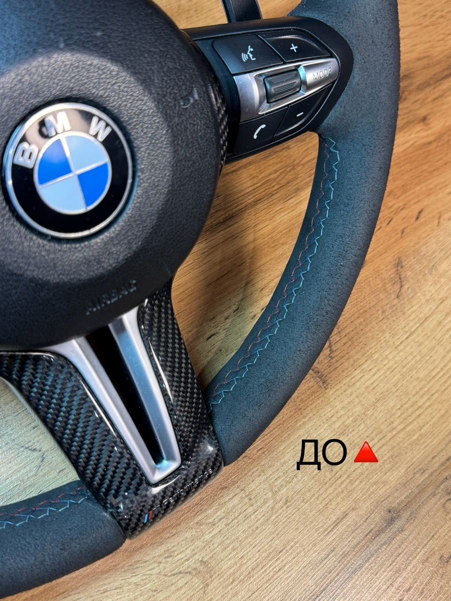 Руль от BMW X6 M перетянули под оригинал в алькантару с добавлением M строчки. Рули перетягиваем с сохранением штатного подогрева! В кожу, алькантару. Можем перетянуть подушку, перекрасить пластик и даже изменить анатомию руля.