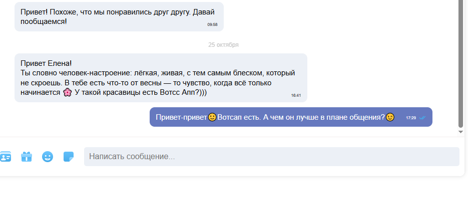 Мне тут высказали предположение под прошлой статьей, что поначалу думали, что я на сайте знакомств зарегистрировалась, чтобы было о чем в блоге писать. Делать мне больше нечего😏Этот блог появился потому, что много накопилось в голове и в душе. А не так - завела блог непонятно для чего, а потом искала, что в нем писать. Недавно, кстати, подумывала бросить блог, как и бросить искать мужчину. Потом одно за одним прошли два озарения. Временно передумала все бросать. Собственно, я блог затем и заводила, чтобы расставить все точки над "и" по теме отношений. Допишу в этой статье, что еще происходит на сайте знакомств. Давно не было ботов, а тут появился. Увидела, что предлагает не телеграмм, и решила подыграть. Зависла на вопросе: "Он правда так думает или пишет то, что, как ему кажется, женщина хочет услышать?" На вопрос для себя не ответила. Развеселил меня вечно сексуально неудовлетворенный деятель🤣🤣🤣Зацените его выход из-за печки! Отсмеялась, а потом думаю, а вдруг я его с кем-то спу