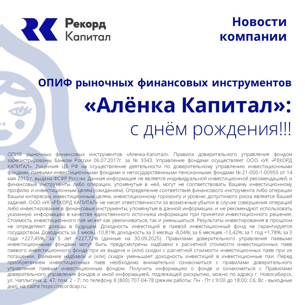 День рождения легендарного фонда! Уважаемые пайщики! Сегодня (27.10.2025) ОПИФ рыночных финансовых инструментов «Алёнка-Капитал» отмечает 8 лет со дня формирования! За прошедшие 8 лет ОПИФ рыночных финансовых инструментов «Алёнка- Капитал» 4 раза получал награды Investfunds: 💎«Лучший ПИФ акций – 2019» 💎 «Лучший ПИФ российских акций – 2021» 💎«Лучший ОПИФ рынка акций – 2023» 💎«Лучший ОПИФ рынка акций - 2024». Цена пая за это время превышала отметку в 29 000 рублей, а стоимость чистых активов фонда составила более 1 млрд рублей. Фонд не смог бы получить такие достижения без участия инвесторов. 💙 Мы искренне благодарны каждому из Вас за веру в наши проекты и стремление совместно достигать финансовых целей. Именно Ваше доверие и ожидания являются нашим стимулом двигаться и развиваться дальше! #новостикомпании_rc