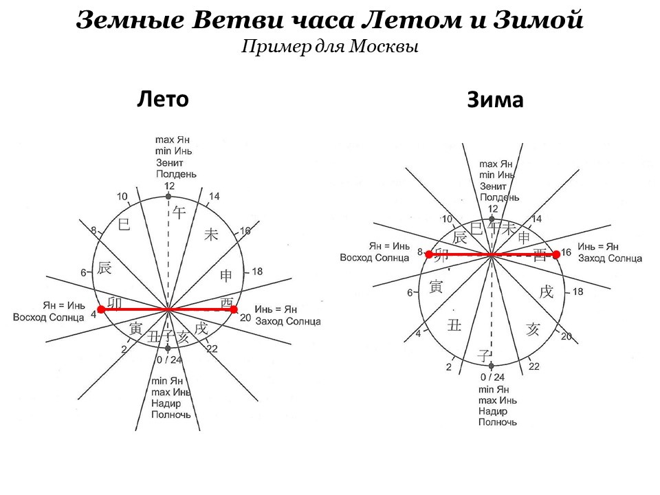 На западе в сутках 24 часа по 60 минут, а в Китае 12 Земных Ветвей. Если поделить 24 на 12, получим равные двухчасовки, однако, реальная продолжительность 12 Земных Ветвей не равна 2 часам, потому что это не административное, а солнечное время. Определение Земной Ветви часа нужно для натальной карты Ба-Цзы, выбора времени Активаций Ци Мэнь и в других практиках, основанных на китайском традиционном календаре. Если определить Земную Ветвь не правильно, то карта Ба-Цзы будет не точной, а Активации не будут работать. Солнечное время зависит от длины светового дня и ночи, которая меняется в течение года и отличается в разных местах. Восход Солнца - середина Ветви Кролика, заход - середина Ветви Петуха, зенит - середина Ветви Лошади, надир - середина Ветви Крысы. Летом день длинный и продолжительность дневных Ветвей (час Дракона, Змеи, Лошади, Овцы, Обезьяны) увеличивается, а продолжительность ночных Ветвей (час Собаки, Свиньи, Крысы, Быка, Тигра) уменьшается. Зимой наоборот. Земные Ветви ча