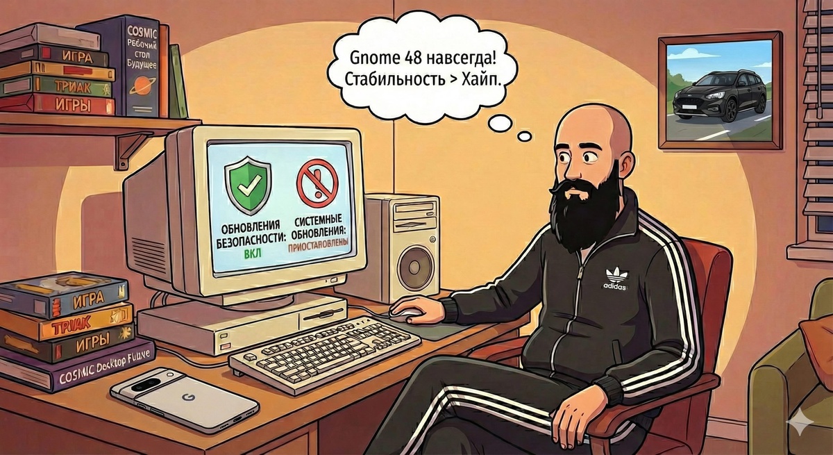 ~ В последнее время буквально так и делаю практически на всех устройствах... Мне понравилось как у Apple реализовано 2 канала... один для системы, другой для апдейтов безопасности. Типа если я не хочу менять свой пользовательский опыт, но хочу быть защищён ... нравится такой подход. Я бы так вообще не обновлялся бы с Gnome 48 лет 10)))) Очевидно, что лучше уже не станет ... А там возможно уже допилят Cosmic и можно будет прикрутить его к StarterKit. Команда разработчиков там вроде поадекватнее гномововских будет.. Вообще в последнее время ни техника новая не впечатляет, ни софтовая часть... Стагнация идёт полным ходом... Хорошо, что я для себя подобрал необходимый функционал, собрал достаточный кейс из железок, можно вообще забить на всё это и очень долго просто пользоваться тем что есть ... Чего я всем и рекомендую... Круто доплыть до такого возраста, где рациональный подход берёт верх, вкус уже сформирован и например даже в плане игр у тебя накапливается такой бэклог, что сов