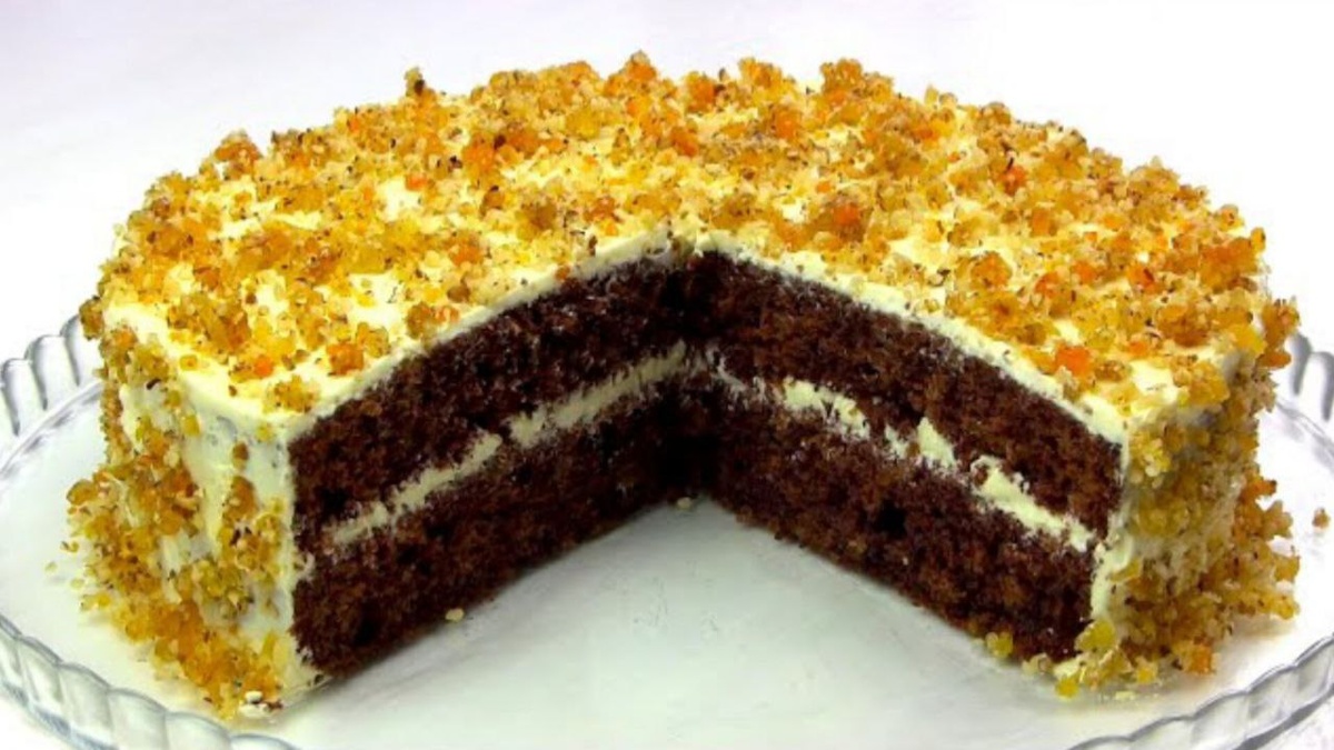 Вкусный торт с курагой, орешками и шоколадным бисквитом Сегодня мы приготовим невероятно вкусный торт с курагой, орешками и шоколадным бисквитом. Это сочетание ингредиентов создает неповторимый вкус, а сам процесс приготовления очень прост и быстр. Для бисквита: 4 яйца 180 г сахара 140 г муки 30 г какао 1 чайная ложка разрыхлителя 50 г кураги 50 г грецких орехов 200 г сливочного масла 1 г ванилина 200 г сгущенного молока Для украшения: 30 г грецких орехов 50 г кураги Приготовление: Взбейте 4 яйца с 180 г сахара до увеличения массы. Просейте 140 г муки вместе с 30 г какао и добавьте 1 чайную ложку разрыхлителя. Перемешайте все лопаткой. Измельчите 50 г кураги и 50 г грецких орехов в блендере до состояния мелкой крошки и добавьте в тесто. Выложите тесто в форму диаметром 22 см, застеленную пергаментом, и выпекайте 30-35 минут при температуре 180°C. Проверьте готовность деревянной шпажкой и полностью остудите бисквит. Взбейте 200 г мягкого сливочного масла миксером в течение пары минут. Д