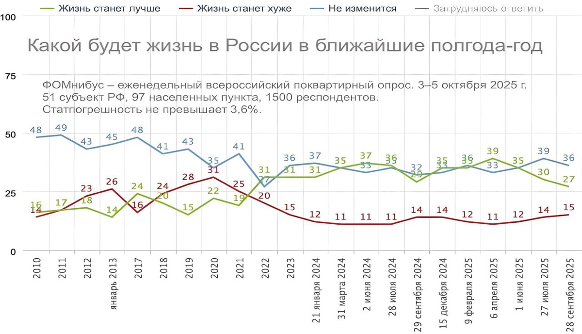 Доля оптимистов среди россиян снизилась до 27%. Весной веру в лучшее выражали 39% граждан, что почти в полтора раза больше. По оценке социологов, общество вступает в «фазу разочарования» на фоне замедления экономики. ПОДПИШИСЬ 🔴 ПРЕДЛОЖИ Ⓜ МАХ НАШ