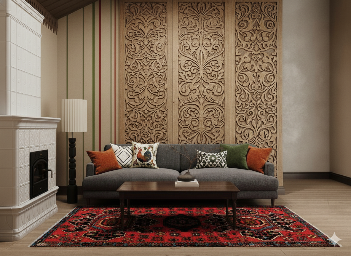 Резьба и роспись: декоративная резьба по дереву – визитная карточка стиля, она украшает мебель, наличники и даже стены. А роспись (растительные мотивы, узоры) может быть на стенах, потолке или предметах декора.