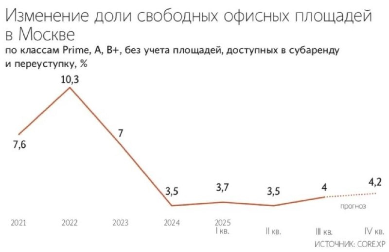 🪖 В Москве растёт доля свободных офисов — впервые с 2022 года — Core.XP В III квартале 2025 года в столице было свободно 4% офисных площадей классов A, B и Prime, что на 0,5 п. п. выше, чем в конце 2024-го. К декабрю показатель может увеличиться до 4,2%. 🔵Главная причина — ввод большого числа новых бизнес-центров. 📌 Больше всего пустующих помещений — на периферии (зоны от ТТК до МКАД и за его пределами). На них приходится около 60% всех свободных офисов Москвы.