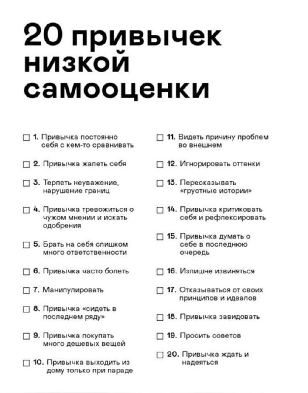 💫Самооценка🤗 Давайте сегодня поговорим о том, что касается каждого из нас, хоть и проявляется по-разному – о самооценке. Точнее, о её отсутствии, о той самой низкой самооценке, которая отравляет жизнь, заставляет сомневаться в себе и видеть мир в серых тонах Знаете, сколько людей приходит ко мне с этой проблемой? Не счесть! 🫣 Возраст, пол, социальный статус – не имеет значения. Низкая самооценка – универсальный спутник человеческих страданий. Она как вирус, который поражает нашу уверенность в себе, подтачивает веру в свои силы и заставляет отказываться от возможностей А как она проявляется, эта низкая самооценка? Да по-разному! Кто-то постоянно критикует себя, замечает только недостатки и обесценивает свои достижения. Кто-то боится высказывать свое мнение, лишь бы не показаться глупым или некомпетентным. Кто-то избегает новых знакомств и социальных ситуаций, потому что уверен, что никому не интересен. Кто-то завидует чужим успехам и чувствует себя неполноценным. Узнаете себя?