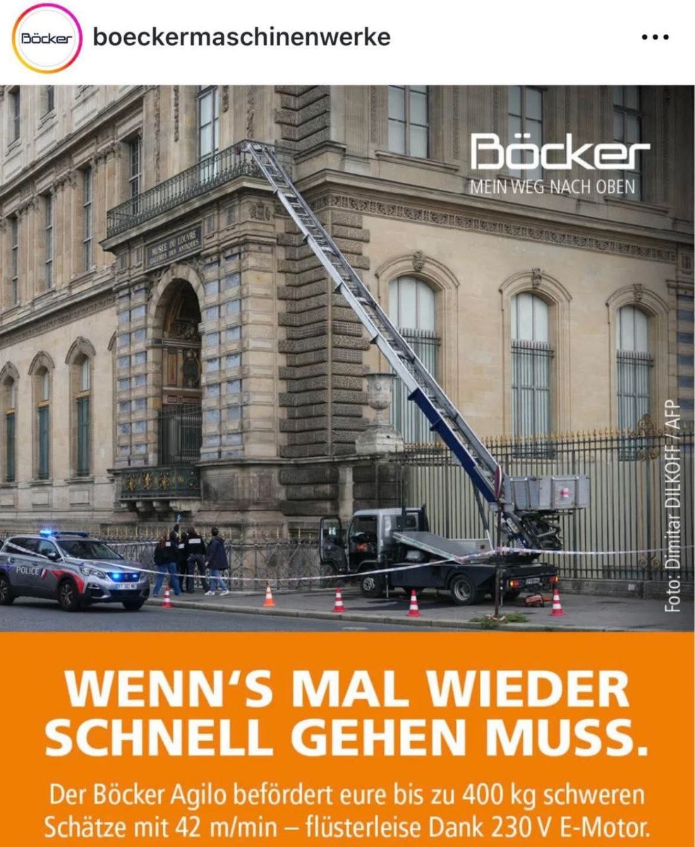 Не было бы счастья, да … Пока в сети циркулируют мемы «Я в Лувр, кому че взять?», у немецкой компания Böcker звездный час! Именно ее грузовой лифт использовали в ограблении музея. Бренд среагировал PRавильно и моментально – уже через сутки компания выложила пост «Когда необходимо действовать быстро» с преимуществами Böcker: - Транспортирует до 400 кг дорогих вашему сердцу вещей - Скорость 42 метра в минуту - Бесшумный благодаря мотору 230V Мы за такие штуки))))) Не за ограбления, конечно же, а за открытость, «поймать момент» и самоиронию.