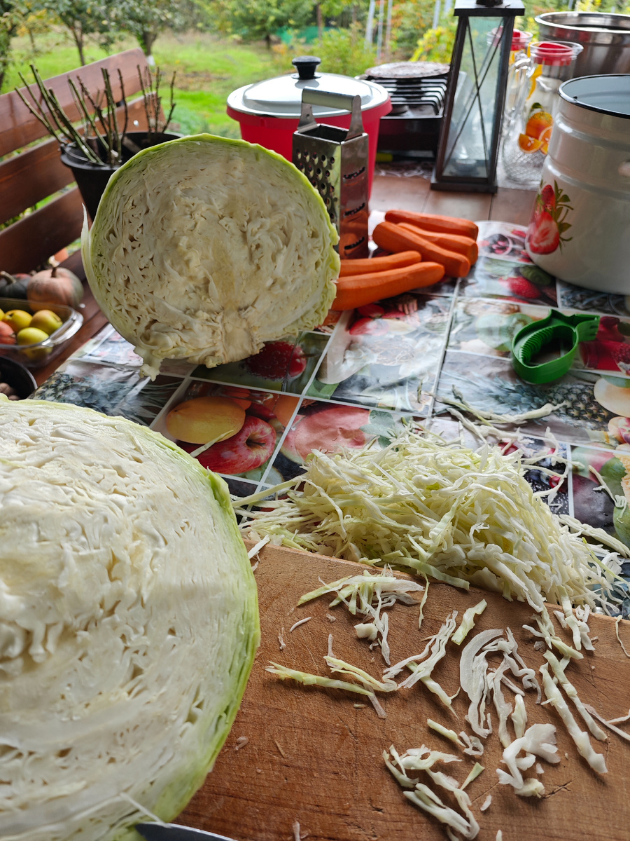 Как только жаркие, душные дни сменяются на бодрящую утреннюю прохладу, вкусы у меня резко меняются. Уже не привлекают упругие огурчики все в пупырышках, крутобокие помидоры и сочные разноцветные перцы. Хочется чего-нибудь поосновательнее. Салат из запечённой свеклы, например. Или тёртую редьку с ароматным маслицем. А ещё лучше солёной капусты. Купила кочан капусты, сейчас как раз появилась капуста из Дагестана, огромная, сочная, как раз для засолки в самый раз. Несколько ярких морковок, сладких и очень вкусных. Соль и лавровый лист. Больше я ничего не добавляю Большую кастрюлю на заднем плане утрамбовала под самую завязку. Тютелька в тютельку. Моя мама в таких случаях всегда сама себя хвалила: - Глаз алмаз! Я тоже себя похвалила. Я молодец! Скоро буду улетать капусту собственного изготовления, а не какой-то магазинный суррогат. Осень все сильнее меняет окружающий мир. У деревьев сквозь зелень стали активно проступать посторонние, непривычно яркие краски. Молодые берёзки в парке, г
