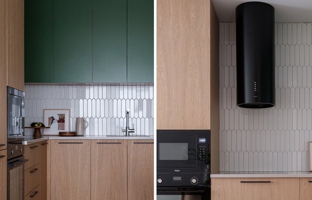 Здесь встречаются природные оттенки, продуманная эргономика и отсутствие визуального шума Квартира площадью 38 м² в московском ЖК «Лучи» спроектирована дизайнером Анной Мальцевой для молодой девушки, работающей в IT. Идея — создать пространство, где можно расслабиться после насыщенного дня, не перегружая интерьер деталями. В отделке преобладают природные оттенки и тактильные материалы, которые формируют ощущение уюта. Дизайнеру удалось оформить кухню так, чтобы она осталась легкой, но при этом вместительной и удобной. Кухня, созданная по индивидуальному проекту, стала сердцем квартиры: Анна спроектировала гарнитур с учетом роста и привычек хозяйки, поэтому высота столешницы получилась немного выше стандартной — это делает работу за ней удобнее. Пространство построено на контрасте фактур: теплый шпон дуба в нижней части мебели гармонирует с гладкими зелеными фасадами сверху. Плитка на фартуке выбрана вытянутой формы, но с мягкими, плавными краями, поэтому белая поверхность не выглядит с