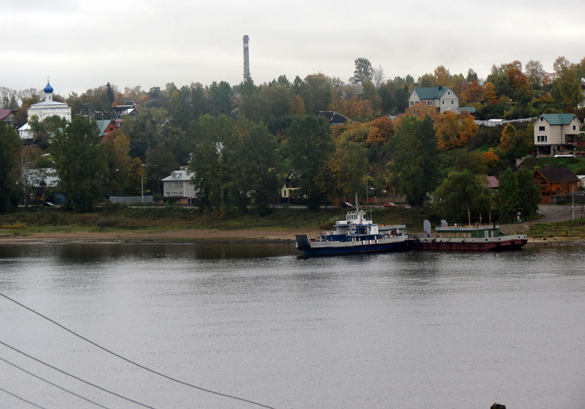Старинный городок Тутаев между Ярославлем и Рыбинском более всего примечателен тем, что на двух берегах Волги стоит без моста. Как так вышло? Он был слеплен в 1922 году из двух старинных городов, каждый со своей историей, но словно не сросся до конца. Чуть ниже впечатляющей пары Воскресенского собора и Казанской церкви - паромная переправа. Её пристань на Борисоглебской стороне (то есть - с правого берега, где основные дороги): И на Романовской, туда и спустимся: Паром ходит с 6:00 до 22:00 каждый час - в "00" отправляясь из Романова, а в "30 минут" из Борисоглебска, причём его "порт приписки" именно Романов, так как последний рейс он делает в 22:15 с правого берега, оставаясь на левом берегу ночевать и в 6 утра вести романовчан на работу. Из получаса почти всё время занимает набор пассажиров и погрузка, сам путь - меньше 5 минут. Тарифы - от 27 рублей (ребёнок) до 1600 (автокраны на шасси "Кразов" и "Уралов"). Обычный билет на взрослого - 55 рублей, корова - 70 рублей, о собаках, овц