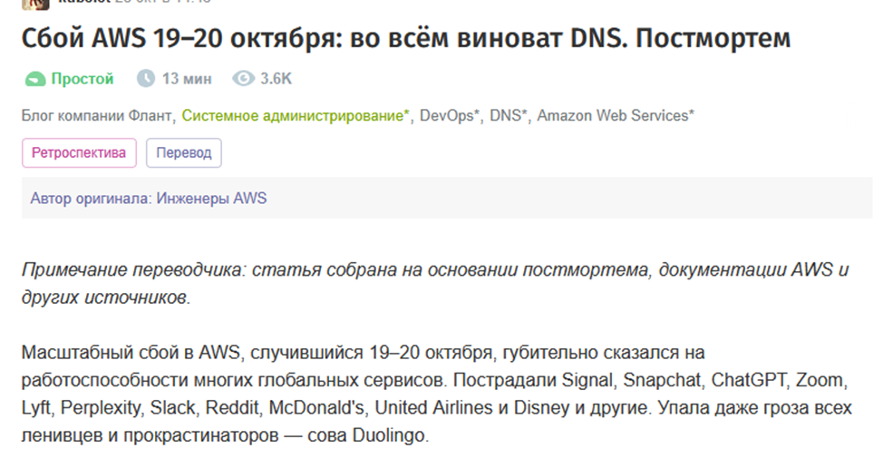 Недавно в США произошла крупная авария у облачного провайдера – прилег AWS: