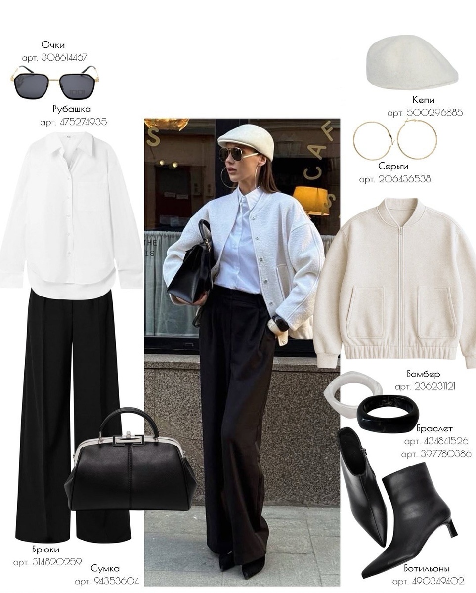 Есть особая магия у вещей, которые не кричат, а шепчут о статусе. Чистые линии, благородные фактуры, сдержанная палитра — и вы уже выглядите как героиня столичных хроник. На этом образе собрана идеальная городская формула: белый верх, глубокий чёрный низ, мягкий свет молочного и немного благородного металла. Идём строго по порядку, как на фото, — разбираем каждую находку с артикулами и советами стилиста.