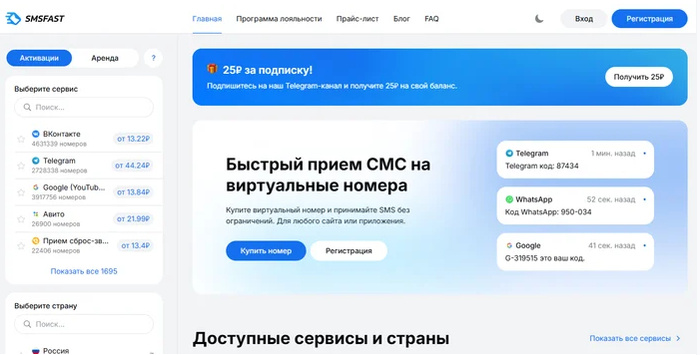 Один из самых популярных сервисов в России и СНГ. Большой выбор стран, низкие цены, но в 2025 году начал замечать частые «заблокированные» номера в WhatsApp. Тем не менее, для TikTok, VK и Instagram — работает отлично. Аренда номера для приема смс здесь обходится в копейки.
