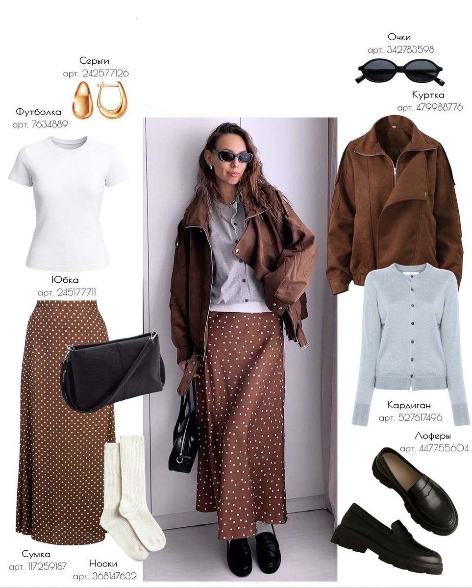 Осень любит мягкие фактуры, спокойные контрасты и чуть-чуть графики. Этот комплект — именно про это: тёплый коричневый, молочный свет, чёрные акценты и игривый горох, который не спорит, а добавляет характер. Идём строго по порядку, как на фото: слева направо, сверху вниз. У каждой вещи — детальное описание и мой совет стилиста. Плавная форма «капля» без острых углов, зеркальная полировка, комфортный вес — мочка не тянется. Такой металл даёт мягкое свечение у лица и поддерживает карамельные оттенки образа. Совет стилиста: оставьте серьги единственным металлическим акцентом у лица — тогда очки из правой колонки станут графичной «рамкой», а не конкурентом. Плотный хлопок с эластаном держит форму, не просвечивает и не собирается в складки под кардиганом. Рукав закрывает верх руки, горловина аккуратно обрамляет шею. Совет стилиста: заправляйте футболку полностью в юбку — это подчеркнёт талию и даст чистую вертикаль слоёв. Плавное А-силуэтное расширение без лишнего объёма на бёдрах. Плотный