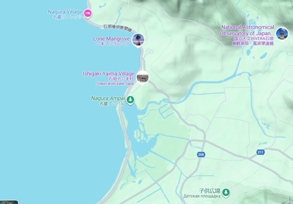 Чуть северней пляжа Фусаки: расположен пляж Нагура: В этом в морской залив впадает река одноименная река Нагура, образуя пойму с мангровыми лесами, которая оголяется при отливе. Вот вид на эту пойму с мостом Нагура из нашей прогулки по лесопарку Исикаги: Переходим речку Нагуру, несущую свои воды в океан среди тропических зарослей: Вид за залив с автострады, проложенной вдоль побережья: Мангровое дерево на бетонных цилиндрах, укрепляющих дорогу Вид на северо-западный полуостров Сакиэда. Там много своих пляжей. Карта национального парка Вид с моста на устье реки Нагура Дорога на побережье и пляж. Здесь под мостом пресная вода из реки соединяется с морской соленой. Пляж Нагуру: Вода чистейшая: Через весь пляж пройти нет возможности из-за мангровой растительности, уходящей в море. Поэтому для прохода к другом участку вернемся на дорогу: На этом пляже больше гальки и ракушечника: В первой половине декабря на нем встречаются в основном рыбаки: Прибрежная растительность: Ещ