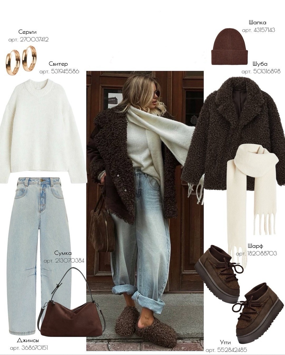 Зима любит объятия: мягкие фактуры, уютные объёмы и палитру, от которой теплеет даже в снежный день. В этом образе сошлись сливочные оттенки и глубокий шоколад, светлый деним и пушистые текстуры. Получился комплект, который одинаково хорош для прогулки, кофе навынос и неспешных дел по городу. Разберём каждую вещь строго по порядку, как на фото — слева направо и сверху вниз — и сложим идеальную формулу зимнего стиля. Характер. Гладкие кольца среднего диаметра с «объёмным» профилем. Металл тёплого оттенка даёт мягкое свечение у лица и не спорит с молочной гаммой комплекта. Лёгкие, уши не устают даже к вечеру. Зачем здесь. Вся капсула построена на фактурах; гладкая поверхность серёг — тот самый «отточенный» штрих, который делает образ собранным. Совет стилиста. Надевайте серьги без дополнительных украшений на шее — в зимних слоях лаконичный блеск у лица звучит чище. Посадка и тактильность. Объёмная посадка без приталивания, мягкая резинка на манжетах и по низу, уютная круглая горловина.