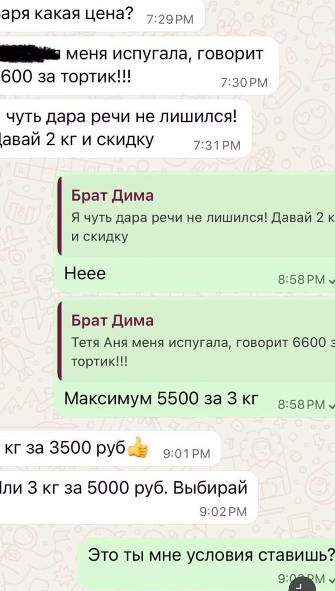 Вопрос к кондитерам: ваши родственники тоже так относятся к вашему труду? Честно говоря, все мои заказчики (которых я даже лично не знаю) самые прекрасные люди, которые меня ценят. А вот родственники - отдельная история. Обратился двоюродный брат с просьбой о заказе торта, сразу же начал давить на стоимость, что очень дорого. Начал торговаться, как на базаре... Не знаю, поступила ли я правильно, но нагрубила, есть такое...(просто накипело). Зла я на этого человека не держу, каждый выбирает сам, что ему кушать. Считаю, что торговаться можно на базаре, а не с родными. Это некрасиво, неуважительно, невоспитанно." ❓Как, на ваш взгляд, следует выстраивать деловые отношения с друзьями и родственниками, чтобы не страдали ни личные чувства, ни профессиональная самооценка? ❓Почему творческий труд (кондитера, художника, дизайнера) особенно часто сталкивается с обесцениванием со стороны близких? ❓Что, по-вашему, стоит за фразой «каждый выбирает сам, что ему кушать»? Это проявление