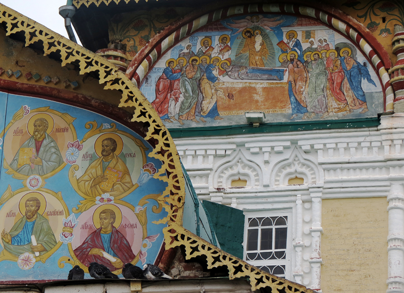 Борисоглебск, то есть правобережная центральная часть старинного Тутаева - город (ладно, пол-города) одной достопримечательности. Достопримечательность эту - удивительный Воскресенский собор, который часто посещают космонавты, - я показывал отдельно. А теперь пройдёмся вокруг. Такой цельности, как на Романовской стороне, нет и в помине, старые здания единичны, и самими яркими памятниками считаются две гостиницы начала 19 века. Теремок напротив новостройки: Ну и всякое по мелочи: В том числе сильно перестроенный торговый ряд: Положение могли бы исправить палаты Дергаловых 17-го века, в народе "дом Бирона" - по легенде, этот курляндский барон, фаворит императрицы, тут был в ссылке, или скорее по дороге в ссылку - упекли его, как мятежных угличан, в зауральский Пелым. Но в отличие от "домиков Петра", обычно являющихся просто самым старым зданием, тут эта легенда более правдоподобна - не так уж известен и совсем не любим в народе был Эрнст Бирон, чтобы отождеставлять с ним дом без явных на