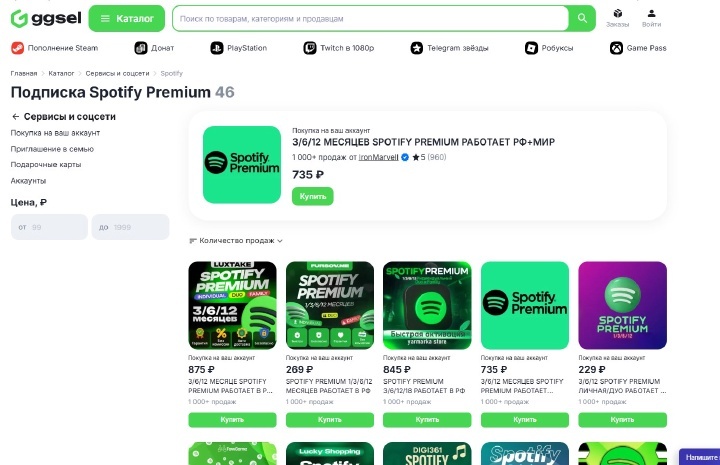 GGSEL — крупная площадка цифровых товаров, где можно купить подписку Спотифай Премиум на месяц, полгода или год. Здесь работает система рейтингов: у каждого продавца видны отзывы, статистика сделок и длительность работы в сервисе.