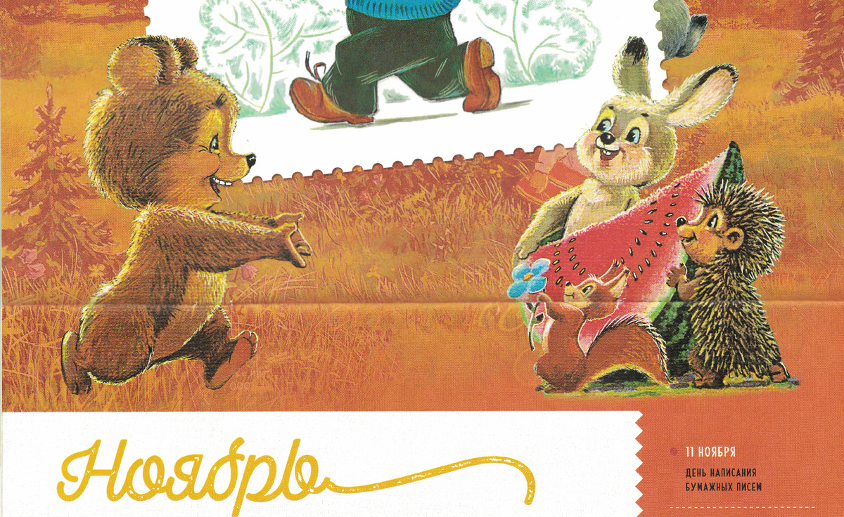 С добрым утром, друзья! Признавайтесь, как провели Велесову ночь))? Встретились ли вам чудеса, или вы просто крепко проспали переход от осени к зиме? Как бы там ни было - на дворе 1 ноября! Здравствуй, третий месяц осени! Природа еще противится грядущей зиме, деревья стоят в золоте и торжественных нарядах, что очень радует мой глаз обожательницы осенней эстетики. И даже мои календари окрашены в золотисто-рыжие оттенки. Зверята Сутеева, как всегда, несут добро, улыбки и угощения: И напоминают о предстоящих важных ноябрьских датах: 11 ноября - день написания бумажных писем! Интересно, многие ли обменяются настоящими конвертами и открытками)))? Думаю, нет... Уж очень далеки мы стали от живого общения... Давайте возрождать эпистолярный жанр! Загадаю себе получить настоящие живые весточки, тем более, что как раз в затянувшемся пути аж две посылки в мой адрес. Надеюсь, хоть в честь праздника дойдут))). Ну а 18 ноября - один из главных волшебных праздников года, День рождения Деда Мороза! В
