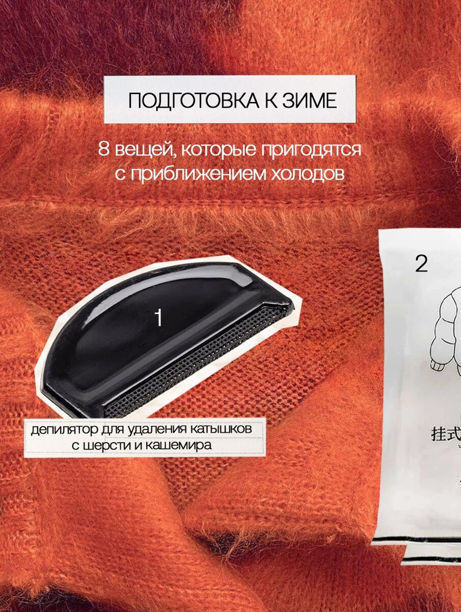 8 вещей для подготовки к зиме: ⊛ депилятор для удаления катышков ⊛ пакеты для вакуумного хранения ⊛ креповая щетка ⊛ кондиционер-парфюм в гранулах ⊛ ручной отпариватель ⊛ ароматическое саше ⊛ чехлы для одежды с прозрачным окном ⊛ спички в стекле