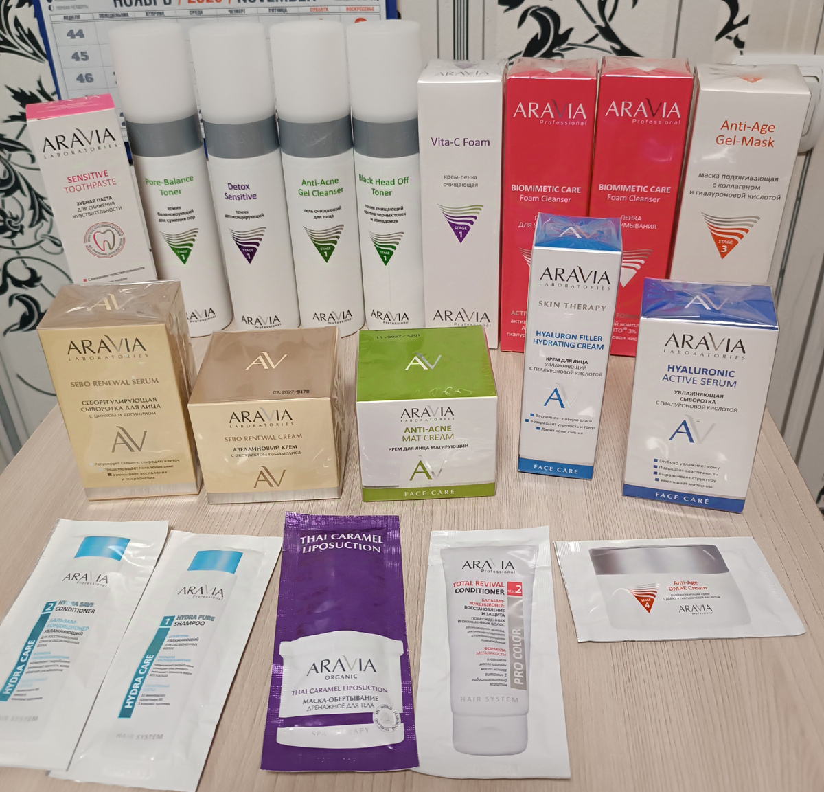 Меня зовут Татьяна. Я мастер депиляции и косметик-эстетист. Работаю на дому, недавно сделали отдельный кабинет, но я мечтаю когда-нибудь приобрести собственную студию и полностью погрузиться в мир эстетической косметологии и депиляции. На канале я пишу разные полезности для ухода за лицом и телом, а также делюсь частичкой своей жизни. Присоединяйтесь, здесь интересно , полезно и эстетично! Примерно раз в месяц мои клиенты пополняют свои запасы. Я их так приучила. Вернее подсказала, что менять косметику из массмаркета на профессиональную можно постепенно. Это даёт возможность безболезненно выделять небольшую сумму на косметику. И большинство девочек пользуются этим советом и довольны результатом. Вот и вчера я забрала очередной заказ, а сегодня уже показываю. Сначала покажу общее фото: Я последнее время распробовала зубные пасты от Аравии. В этот раз взяла для снижения чувствительности : Уверена, что не разочаруюсь. Больше себе я ничего не заказывала в этот раз. Очень хорошо идёт серия