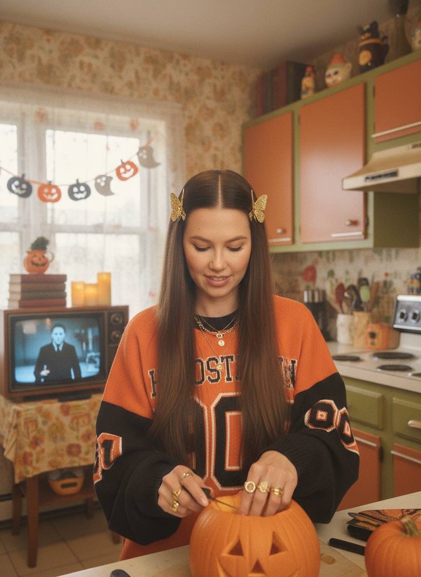 ПРОМТ НА HALLOWEEN 🎃 Crea una foto mía en un estilo Y2K de ensueño parada en una cocina estilo años 70 decorada con decoración vintage de Halloween, con un televisor retro en la parte de atrás mostrando la película Halloween en la pantalla, mientras corto una calabaza en una pose pensativa de ensueño su cabello liso castaño largo cae libremente por sus hombros con clips dorados a cada lado. Lleva joyas delicadas que incluyen delicados collares y accesorios de oro y anillos gruesos de oro. Lleva un suéter de fútbol escolar de gran tamaño.No cambies mis rasgos faciales, no cambies mi cara. Кидайте в комменты, что получилось ⤵️