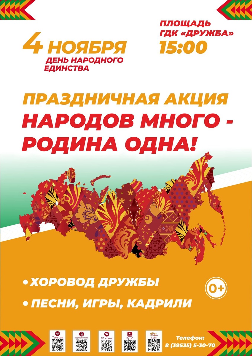 Дорогие устьилимцы! Приглашаем вас 4 ноября в 15 часов на праздничную акцию "Народов много - Родина одна!". На площади Дворца культуры "Дружба" вместе будем петь, танцевать кадриль и, конечно же, заведем традиционный хоровод дружбы. В фойе ГДК "Дружба" состоится выставка-продажа изделий декоративно-прикладного творчества. Вырученные средства будут направлены на помощь нашим землякам, которые участвуют в специальной военной операции. Так же в этот день будет организован благотворительный сбор участникам СВО. Приветствуем горожан в русской национальной одежде и одежде народов, населяющих нашу многонациональную Родину. В 14 часов в универсальном зале для детей состоится познавательно-развлекательная программа "Игры разных народов".