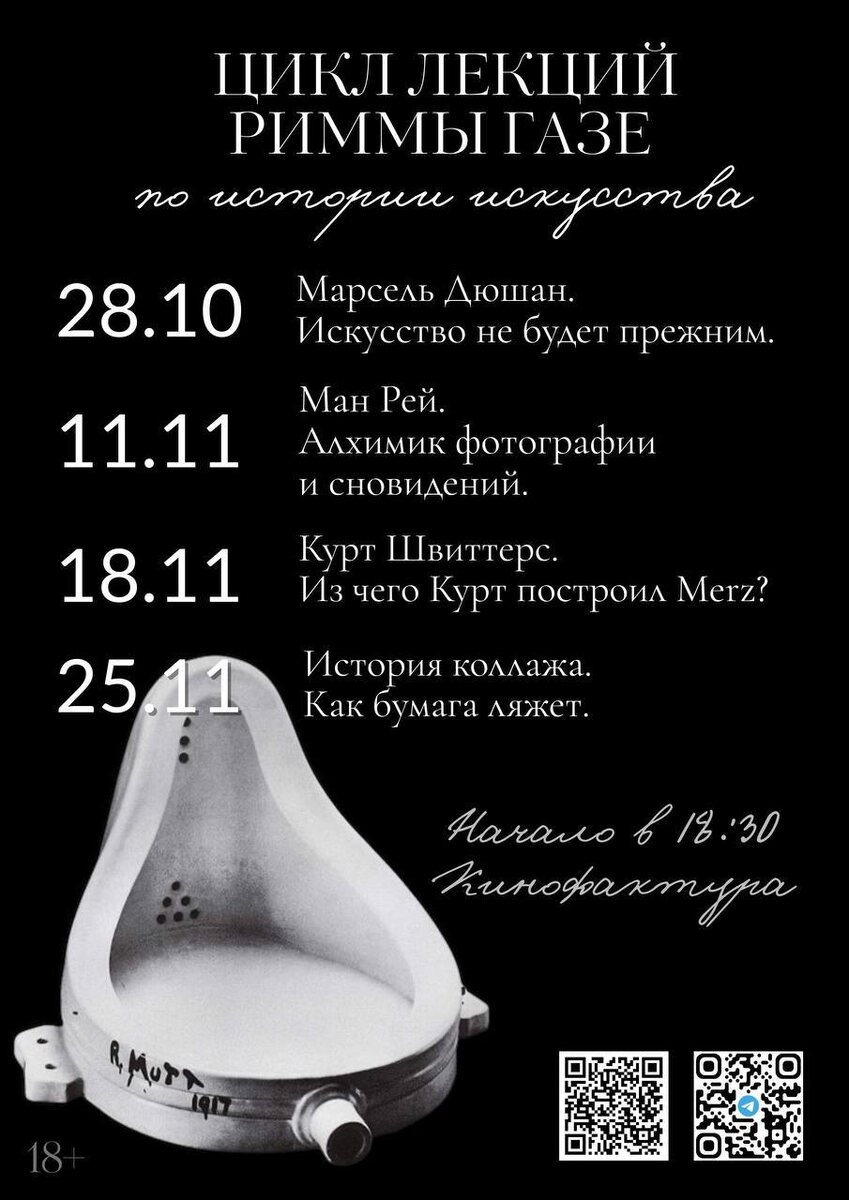 ⏺ Слушаем цикл лекций Риммы Газе «Игры, случайности, провокации. Дадаизм» Начало XX века — время радикального пересмотра художественного языка. Марсель Дюшан, Ман Рей и Курт Швиттерс по-новому определили границы искусства, поставив в центр идею, процесс, эксперимент. • 28 октября — Марсель Дюшан. Искусство не будет прежним. • 11 ноября — Ман Рей. Алхимик фотографии и сновидений. • 18 ноября — Курт Швиттерс. Из чего Курт построил Merz? • 25 ноября — История коллажа. Как бумага ляжет. Подробности здесь. 📍 Кинофактура, ул. Варварская, 32 Начало лекций в 18:30