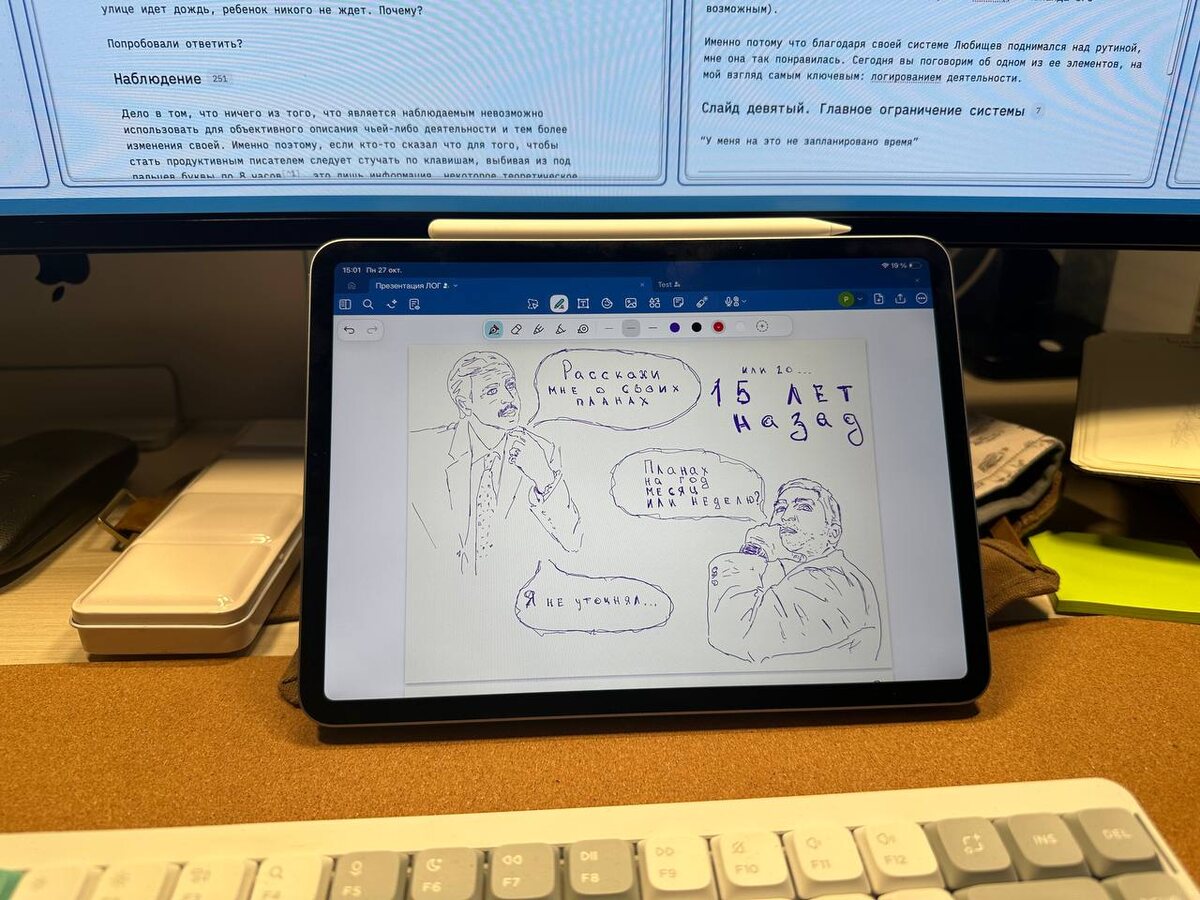 ### ТИМЛИД 2025 Готовлюсь к Тимлиду, в этом году так случилось (запланировано), что я открываю конференцию своим докладом про “Систему интеллектуальной продуктивности”, вернее одним лишь инструментом из всей системы – логированием, ну и параллельно расскажу про систему медленной продуктивности и Любищева и его систему. Доклад получается “мясистый”, то есть очень плотный по материалу, я уже попробовал его прогнать дважды: один раз с программным комитетом, второй уже в качестве открытой лекции для нашего сообщества. И вот какое дело: мне тут высказали мнение о презентации (какое не скажу), интересно услышать ваше мнение. Как вам такой вот формат слайдов? Полностью ручная работа, каждая буквочка и каждая завитушка нарисованы от руки, здесь нет нейросетей и прочих “ускорителей” творческого процесса. Скажите, как вам слайдики в таком стиле?