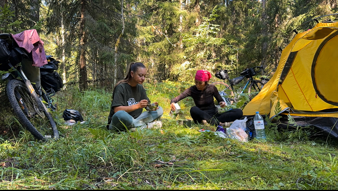 Едем дальше до 📍Хаапалампи около 50км. В приложении GoVanlife нашли локации диких кемпингов прямо на берегу Ладоги. Пришлось поискать, чтобы не было людей! Спускали велосипед снова по узкой лесной тропинке. Но наградой стал вид! Поставили палатку на больших скалах.